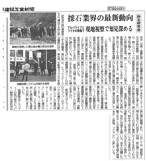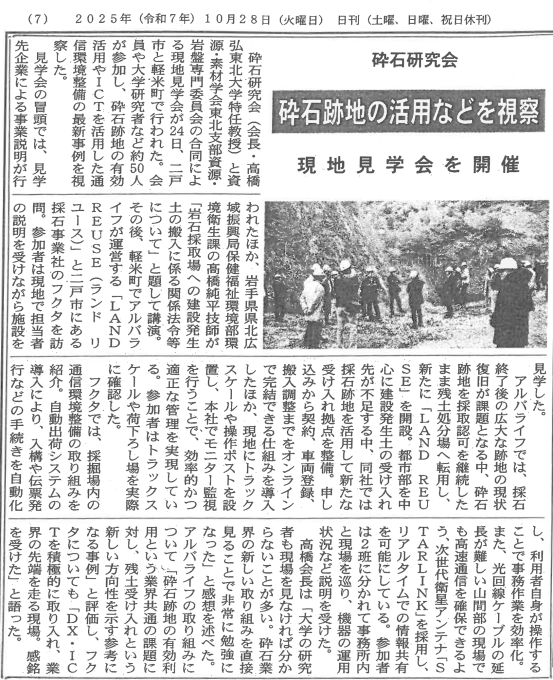 イベントニュース 砕石研究会による現地見学会 10月 27, 2025 308 2025年10月24日(金) 砕石研究会による、当社の採石場跡地と㈱フクタ様の砕石場の現地見学会が行われました。大学、青森県、岩手県、宮城県、福島県、関東などから48名の参加者数でした。【内容】1.採石場跡地を採取認可を継続した状態で残土処分場にした転用した事例2.採石場内における通信環境整備の事例3.バス移動による現地見学開催 現地見学会の様子 説明会資料(PDF) 10月28日(火)建設新聞掲載記事 10月30日(木)岩手建設工業新聞掲載記事
